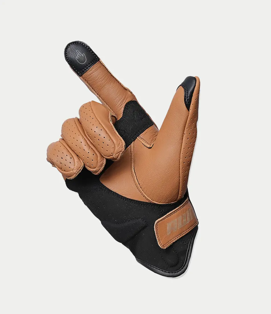 Ride in vintage-inspired style with these two-tone leather gloves, combining classic tan and black for timeless street appeal. Built for comfort and control, they feature touchscreen fingertips and strategic perforations to keep you cool on long urban cruises.